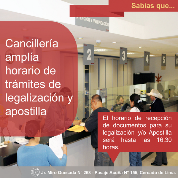 La @CancilleriaPeru amplía horario de trámites de #legalización y #apostilla hasta las 4.30 p.m.pic.twitter.com/NNo9kxwtds