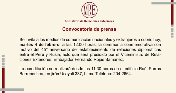 Convocatoria de prensa: Ceremonia por el 45° aniversario de relaciones diplomáticas entre #Perú y #Rusiapic.twitter.com/U5rZaz1dT5