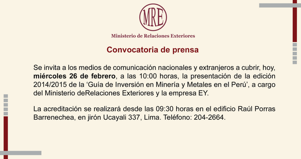 Convocatoria de prensa: Presentación de la 'Guía de Inversiones en Minería y Metales en el #Perú'pic.twitter.com/Pif2YBFXhj