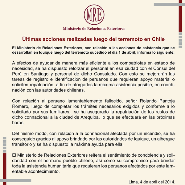 Conoce las últimas acciones realizadas por la @CancilleriaPeru luego del #terremoto en #Chilepic.twitter.com/xZn038enjV