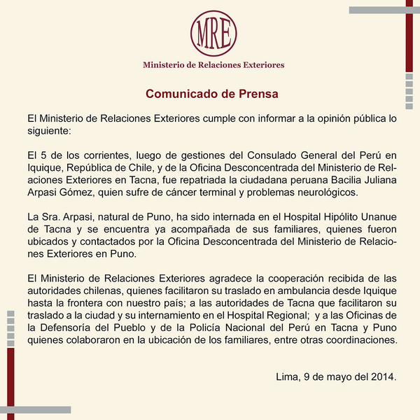 Comunicado: Ciudadana peruana fue repatriada desde #Iquique, #Chilepic.twitter.com/ovWkdk1ouA
