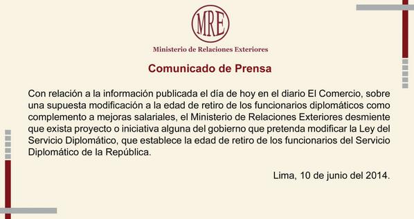 Comunicado de la @CancilleriaPeru aclarando información difundida hoy por @elcomerciopic.twitter.com/vvGdDHQjQl