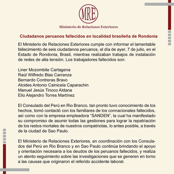 La @CancilleriaPeru informa el lamentable fallecimiento de 6 ciudadanos peruanos en localidad brasileña de Rondoniapic.twitter.com/FdRJeEr2CU