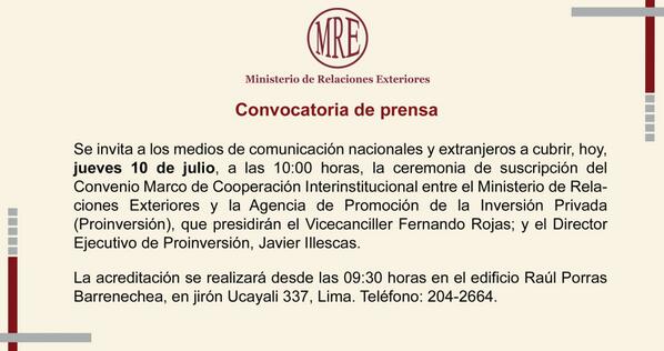 Convocatoria de prensa: Firma de convenio interinstitucional @CancilleriaPeru - @ProInversionPepic.twitter.com/oHnzIAdo62