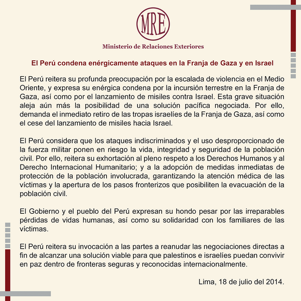 Por fin se pronunciaron "@CancilleriaPeru: El #Perú condena enérgicamente ataques en la Franja de Gaza y en #Israel pic.twitter.com/4RqEEdCvVj"