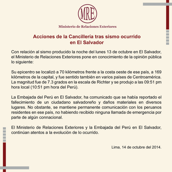 Acciones de la @CancilleriaPeru tras #sismo ocurrido en El Salvadorpic.twitter.com/zNYB7biwTD