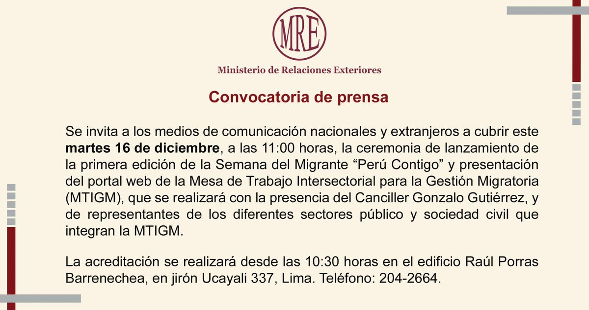 Convocatoria de prensa: Lanzamiento de la Semana del #Migrante ‘#Perú Contigo’pic.twitter.com/ypMefJZQqD