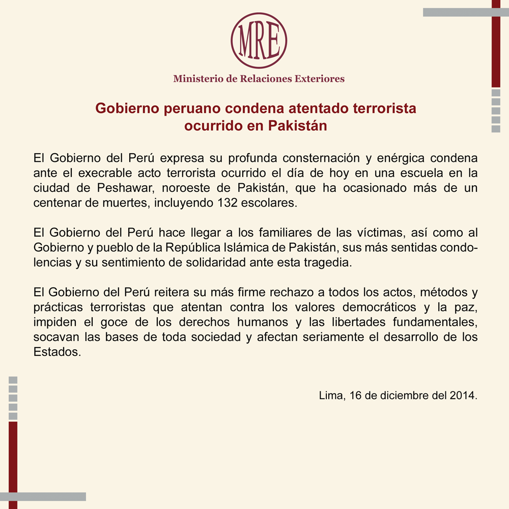 Gobierno peruano condena atentado #terrorista ocurrido en #Pakistánpic.twitter.com/hwA7B6gDs3