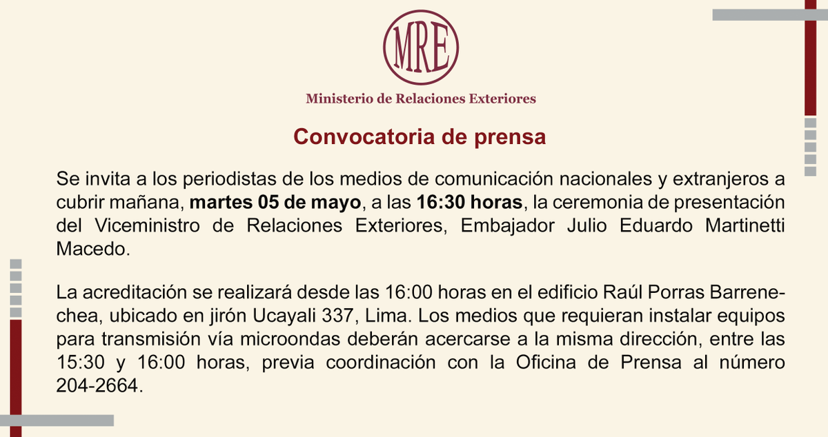 Convocatoria de #prensa para mañana: Ceremonia de presentación del vicecanciller Julio Eduardo Martinettipic.twitter.com/Kjqm5Kfqi5