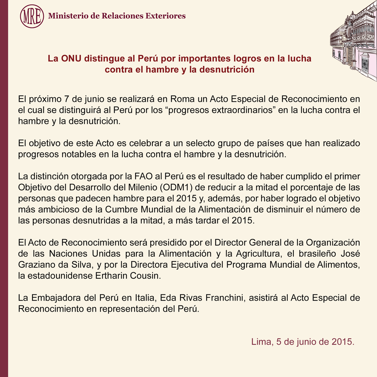 Distinguen al #Perú por “progresos extraordinarios” en lucha contra el hambre y desnutrición http://bit.ly/1Mgx2lB pic.twitter.com/6dpip7nwWV