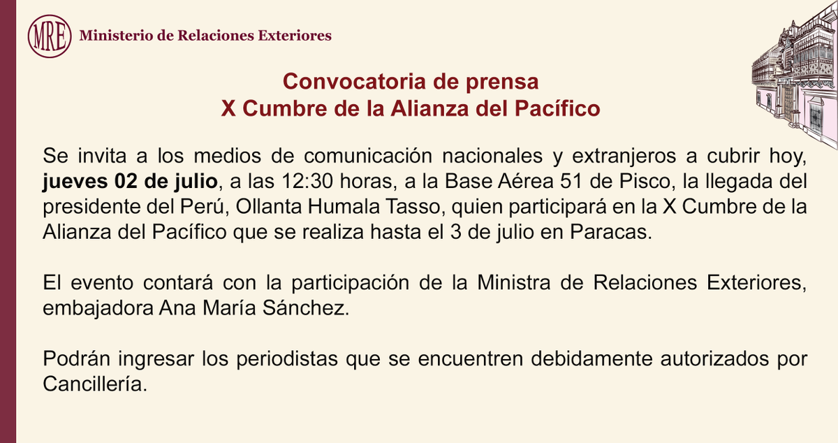 Se invita a los #periodistas acreditados a la #XCumbreAP, a cubrir la llegada del pdte. @Ollanta_HumalaTpic.twitter.com/OA76dEXao4