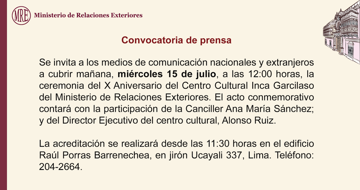 "Convocatoria de #prensa: Ceremonia del 10° aniversario del #CentroCultural Inca Garcilaso de la @CancilleriaPeru pic.twitter.com/UrEm48VV0I"