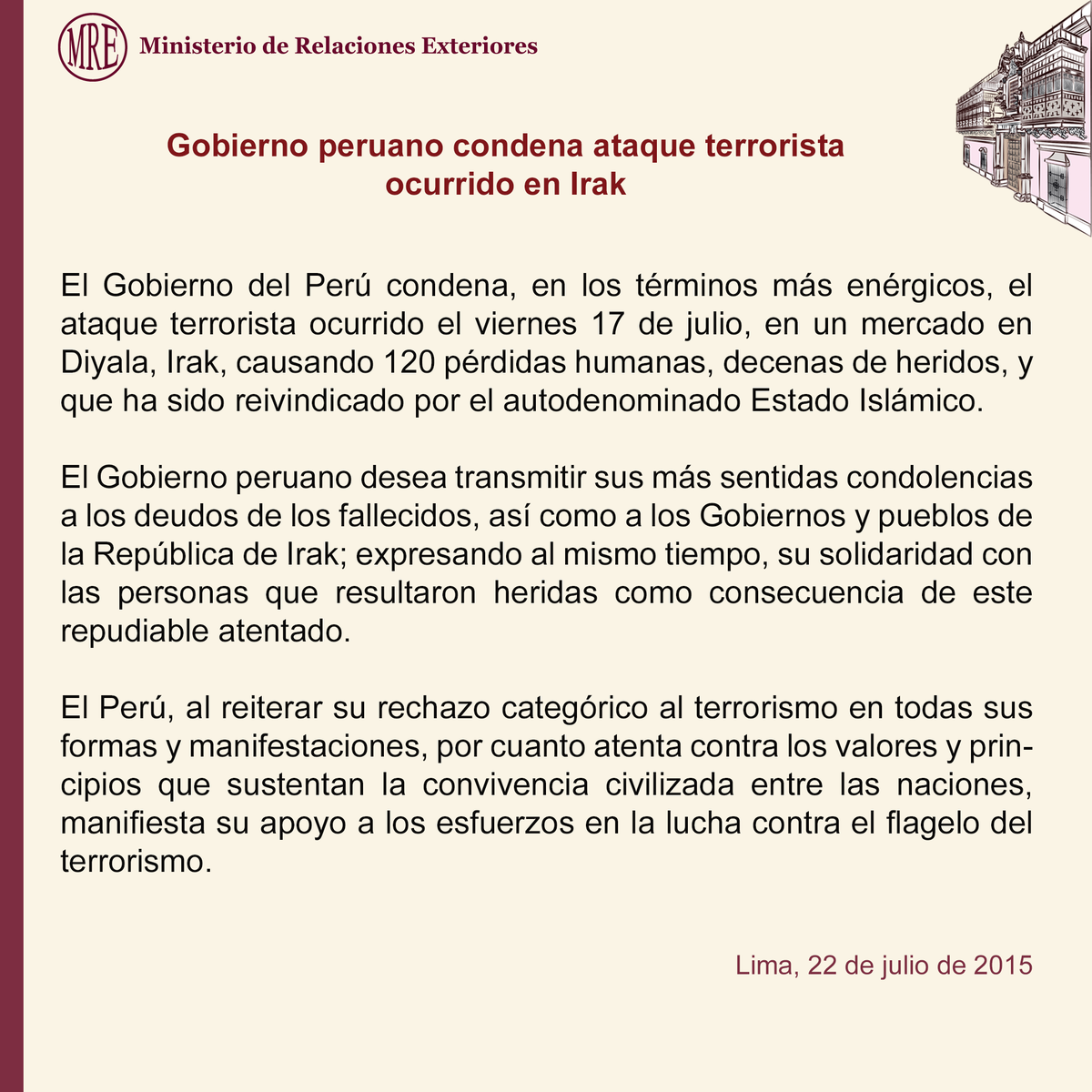 #InfoCancillería: Gobierno del #Perú condena ataque #terrorista ocurrido en #Irakpic.twitter.com/vRwwPvfJyL