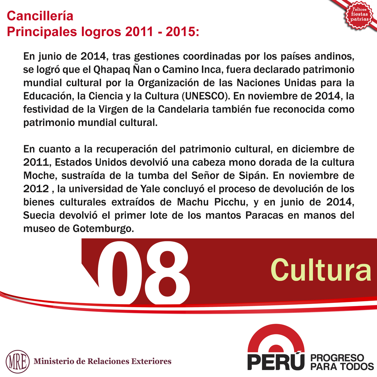 Principales logros de la @CancilleriaPeru 2011-2015: Declaración del #QhapaqÑan como Patrimonio Mundial por @UNESCOpic.twitter.com/jizhaKXtfU