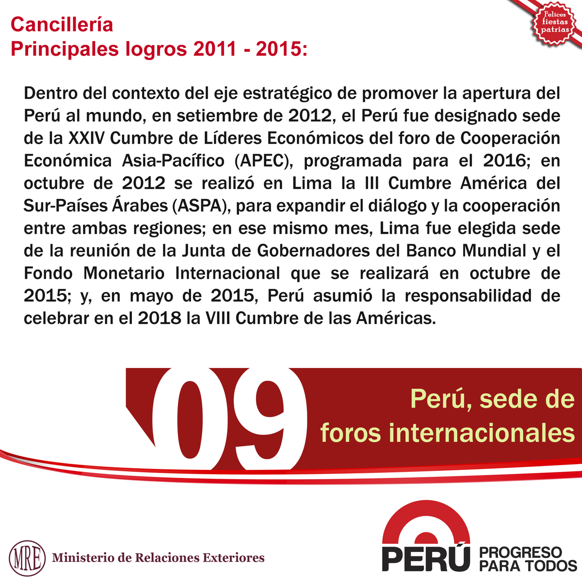 Principales logros de la @CancilleriaPeru 2011-2015: #Perú, sede de reuniones internacionalespic.twitter.com/dnMZfRG9y5
