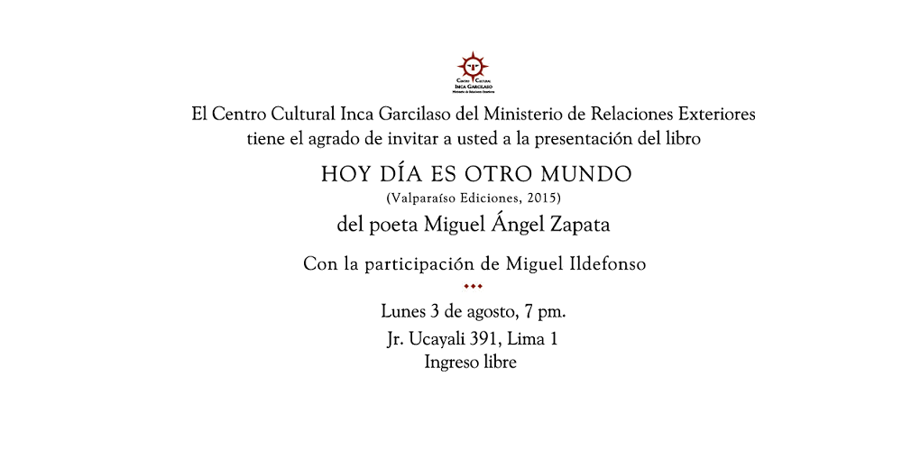 Este lunes en el @CCIncaGarcilaso: Presentación #libro 'Hoy día es otro mundo' de Miguel Ángel Zapata #IngresoLibrepic.twitter.com/VTygaI5wMe