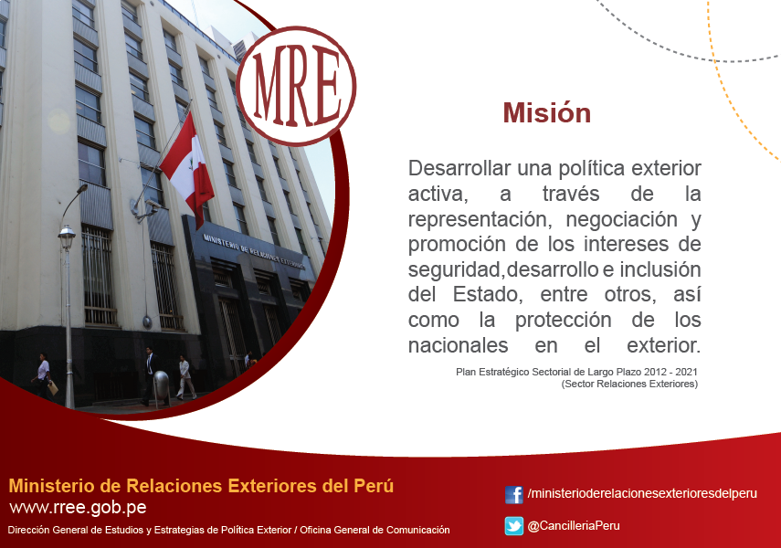 Misión @CancilleriaPeru: Desarrollar política exterior activa y protección de #peruanos en el exteriorpic.twitter.com/CYkHgAISrS