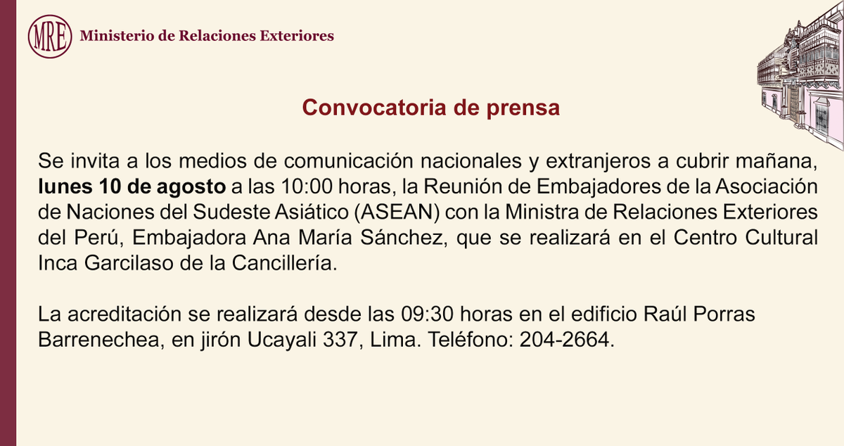 Convocatoria de prensa para mañana: Reunión de Embajadores de la Asociación de Naciones del Sudeste Asiático (@ASEAN)pic.twitter.com/I3qCoMAWPi