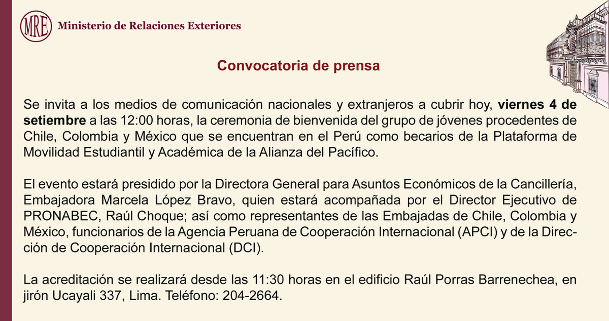 Convocatoria de #prensa: Ceremonia de bienvenida a #becarios de #Chile #Colombia y #México de la @A_delPacificopic.twitter.com/dkcuW4xjzp