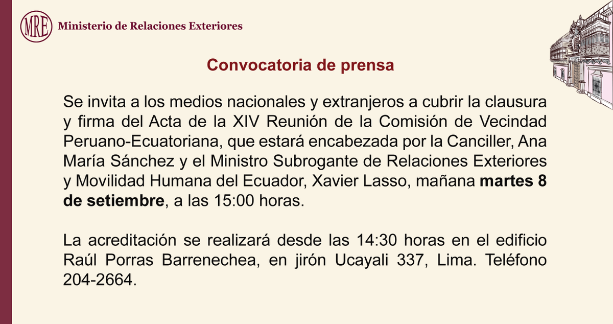 Convocatoria de #prensa: Clausura y firma del acta de la XIV Reunión de Comisión de Vecindad Peruano - Ecuatorianapic.twitter.com/iL8PpEzaA0