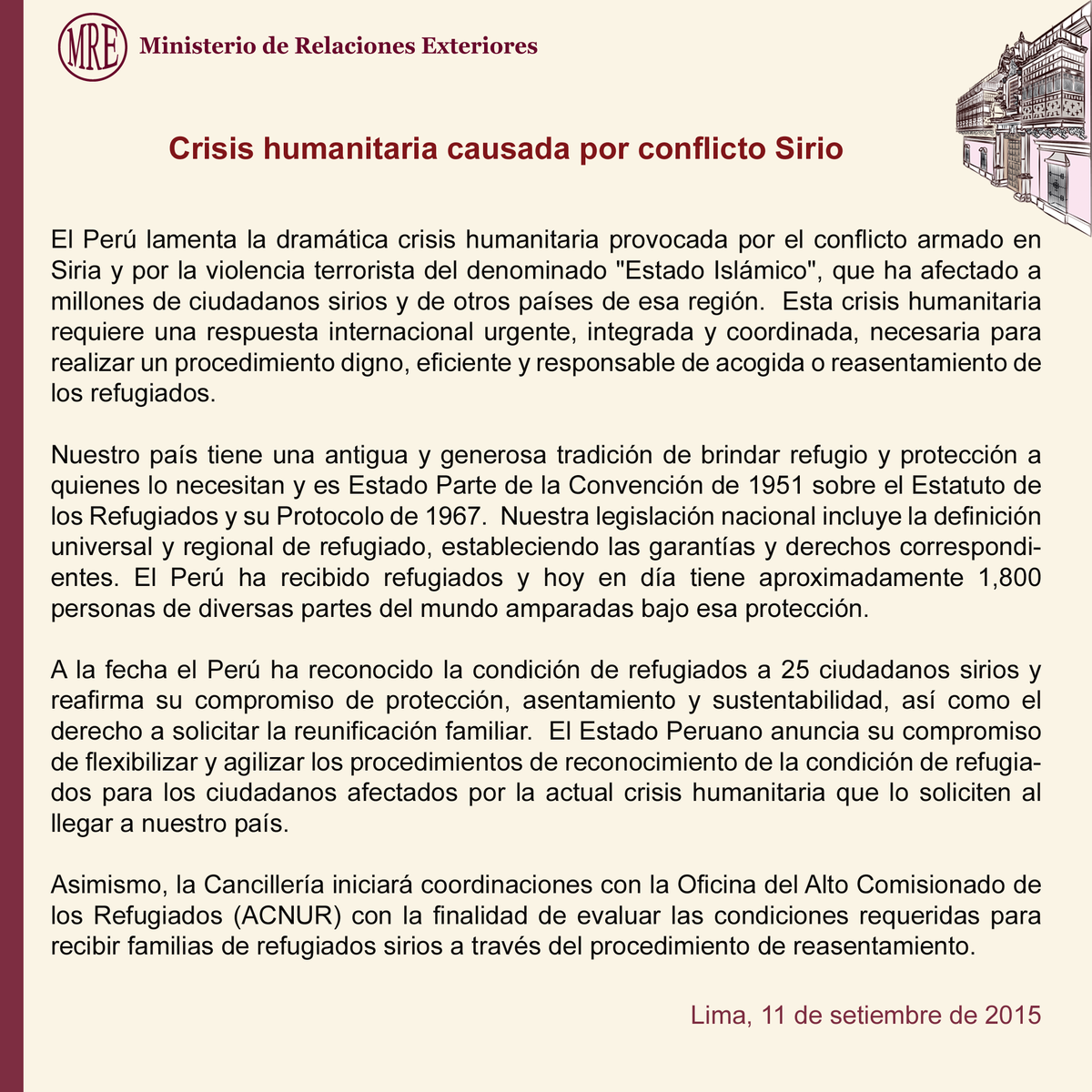 Perú lamenta crisis humanitaria provocada por conflicto armado en #Siria y por violencia #terroristapic.twitter.com/OAGEmBlMzW