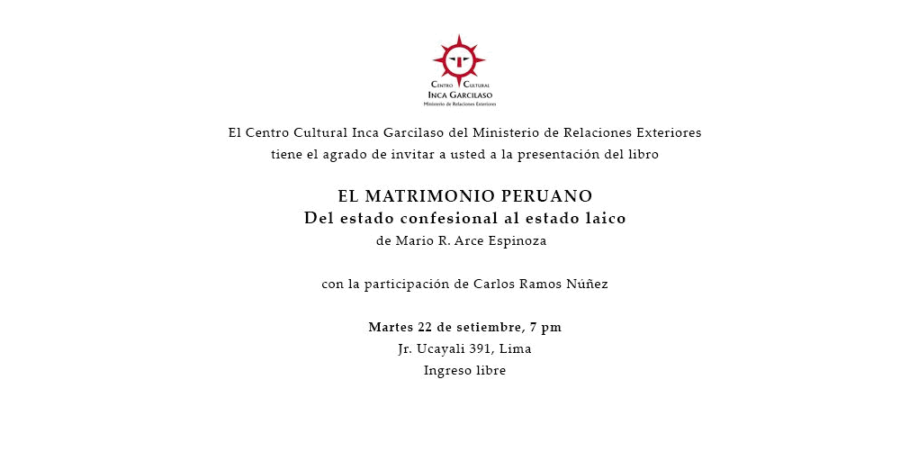 22 de septiembre / @CCIncaGarcilaso: Presentación del #libro "El matrimonio peruano" #IngresoLibrepic.twitter.com/4JvVSgvyt1