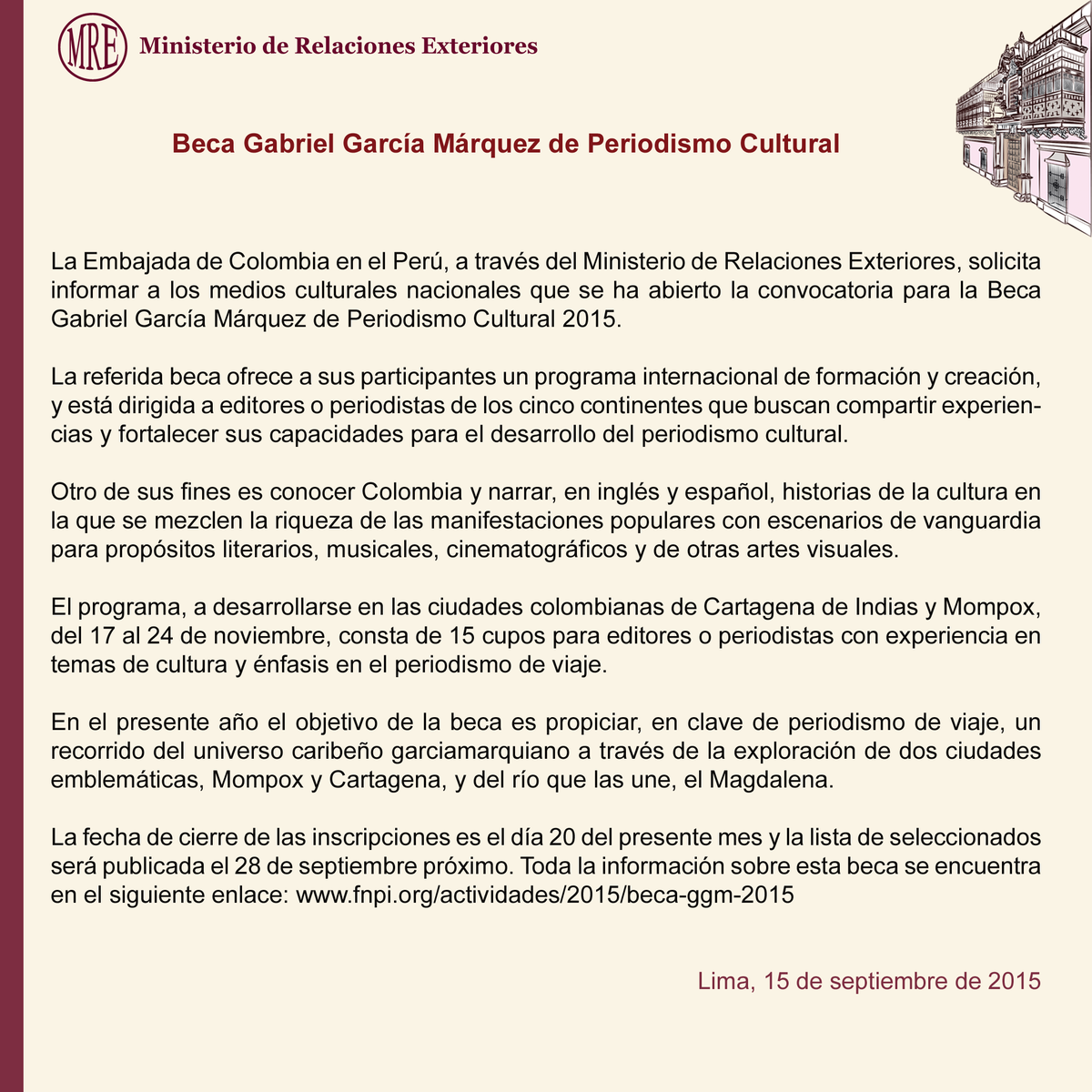 Atención #periodistas: Convocatoria de #beca Gabriel García Márquez de #Periodismo Cultural http://bit.ly/1KgrkP0 pic.twitter.com/6q4Ax1uzgM