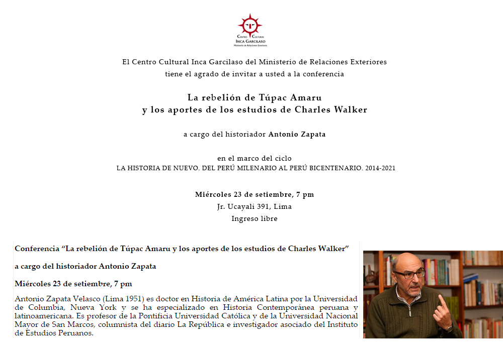 23 de septiembre en el @CCIncaGarcilaso: Conferencia sobre la rebelión de Túpac Amaru #IngresoLibrepic.twitter.com/pzDdUPb4Ln
