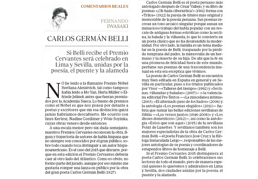 Artículo de opinión del escritor Fernando Iwasaki sobre el #poeta peruano Carlos Germán Belli http://bit.ly/1rlhyAV pic.twitter.com/2E1H5fjzkX