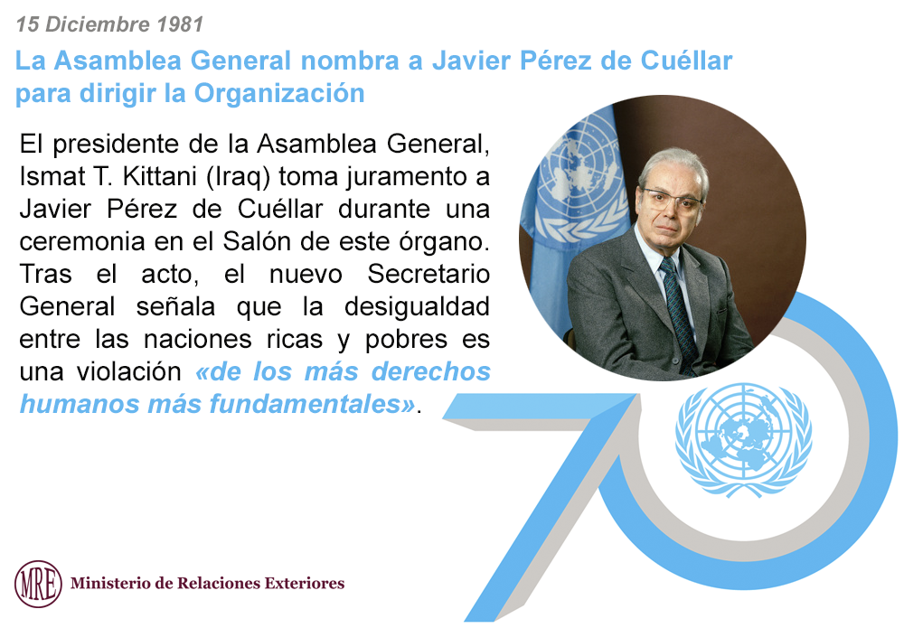 #Vídeo: Javier Pérez de Cuéllar juramenta como secretario general de #ONU http://bit.ly/1Wb0kLX  #ONU70años #UN70pic.twitter.com/vNAMX6SD4X