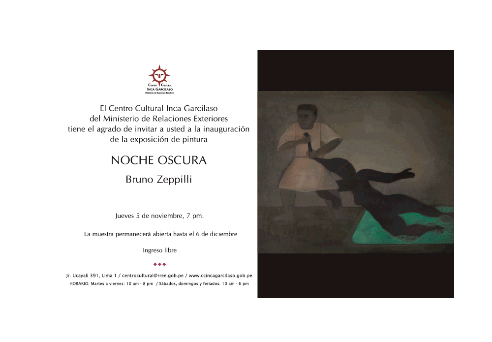 Hoy, 7pm en @CCIncaGarcilaso: Inauguración de #exposición de #pintura 'Noche oscura' de Bruno Zeppilli #IngresoLibrepic.twitter.com/mNeNuMDPDG
