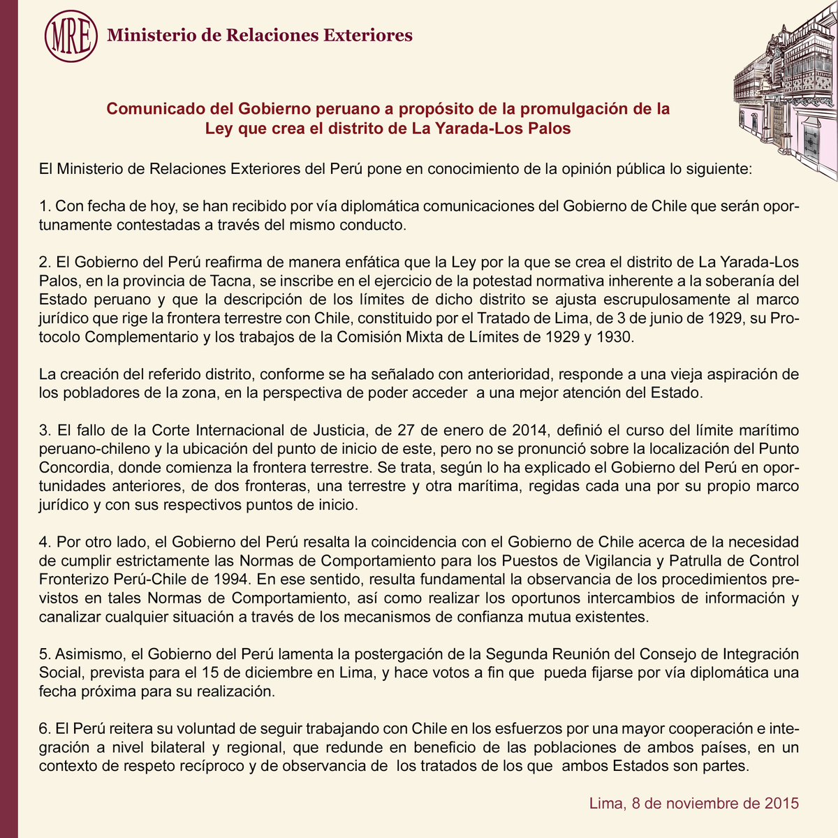 Comunicado del #Perú a propósito de la creación del distrito de #LaYaradaLosPalos http://bit.ly/1NEC0MS pic.twitter.com/y4eorsPkyA