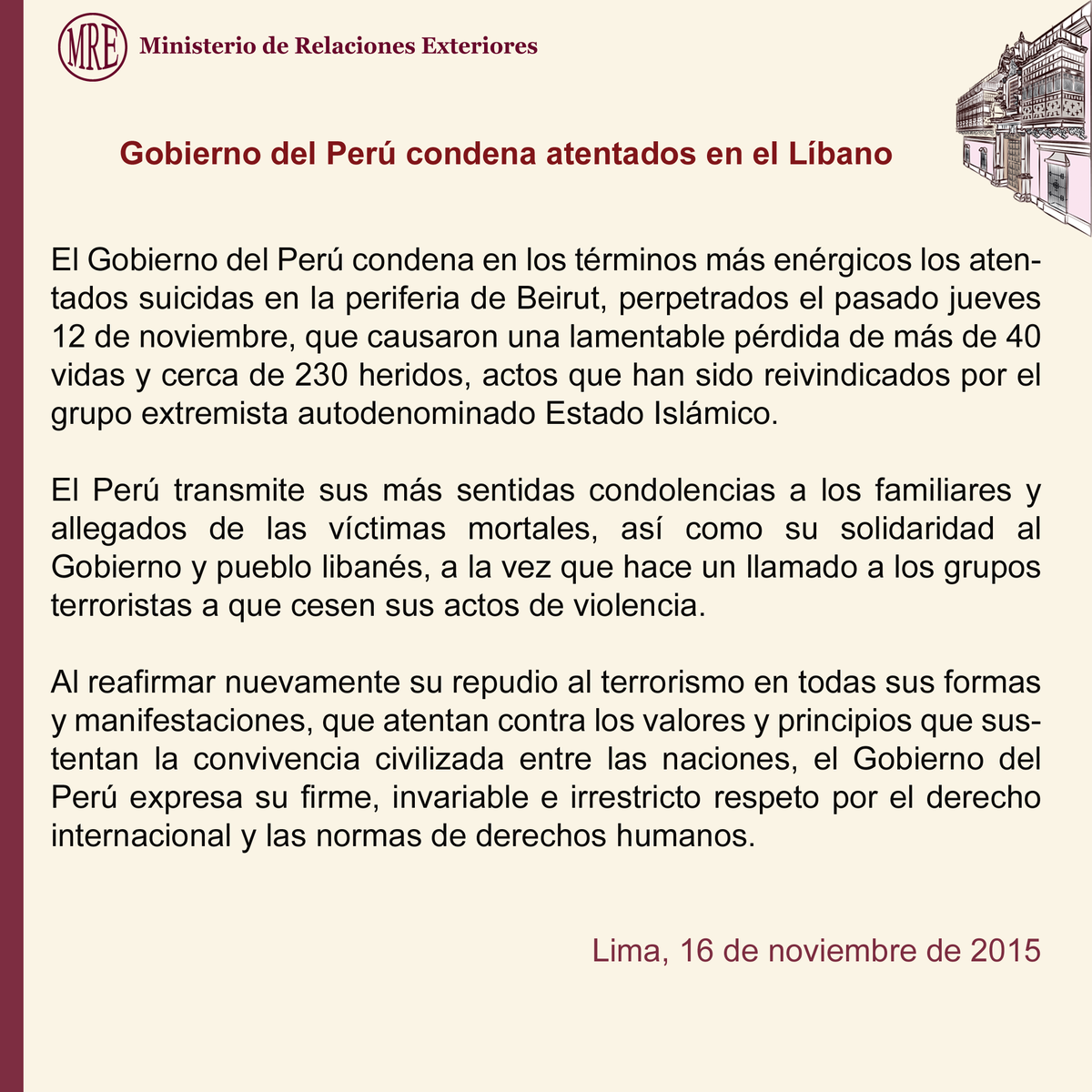 Perú transmite condolencias a los familiares y allegados de las víctimas mortales en el atentado en el #Líbanopic.twitter.com/vCRKTeUkMW