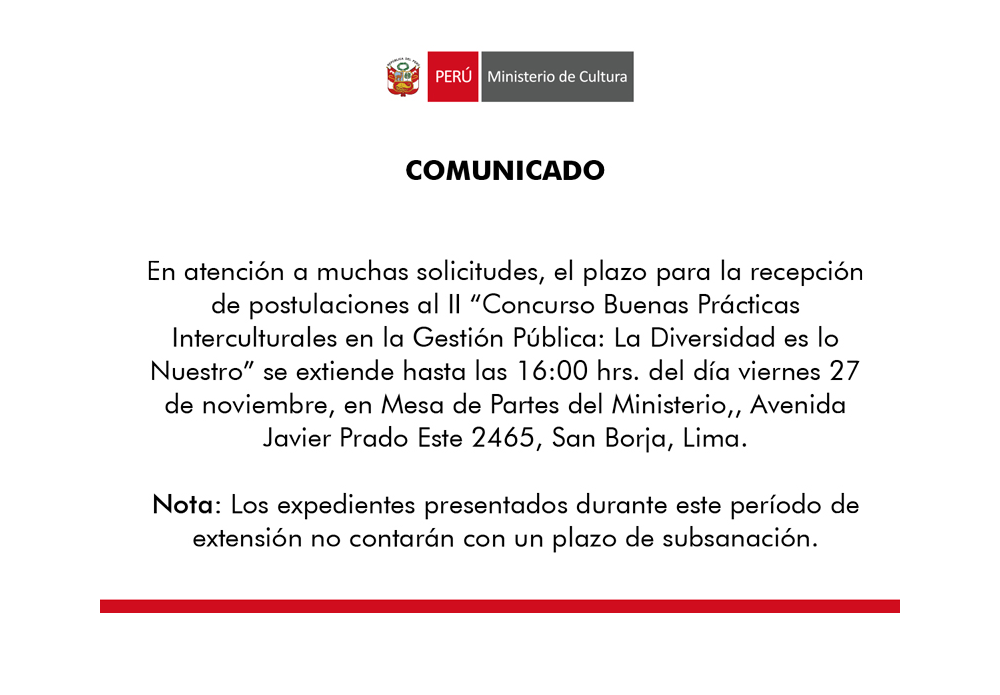 El @MinCulturaPe extiende recepción postulaciones II concurso Buenas Prácticas Interculturales en #GestiónPúblicapic.twitter.com/x1SxDKhBFw