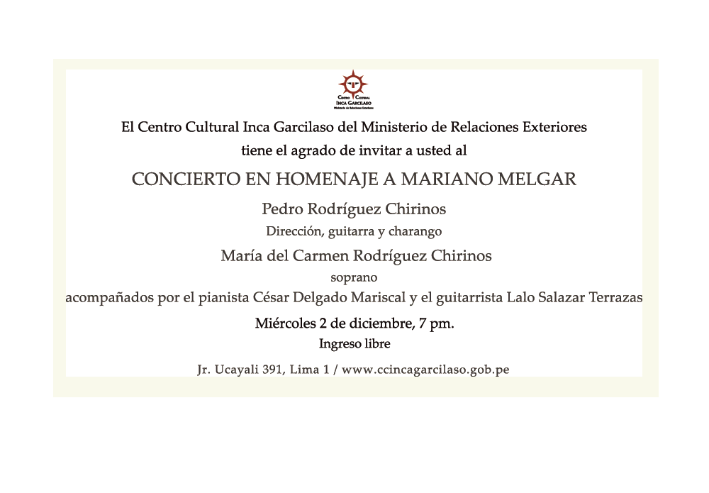Este miércoles en el @CCIncaGarcilaso: Concierto en homenaje a Mariano Melgar #IngresoLibrepic.twitter.com/Q6BgKFhW1q
