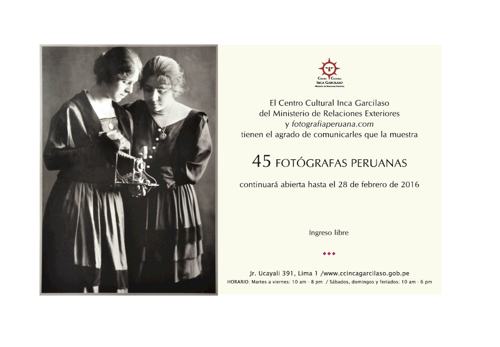 Agenda en @CCIncaGarcilaso: Muestra '45 Fotógrafas peruanas' continuará hasta el 28 de febrero de 2016 #IngresoLibrepic.twitter.com/KM5uel9xdW