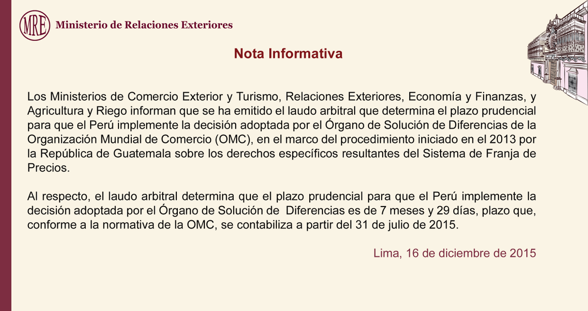 OMC establece plazo prudencial para que #Perú implemente decisión en marco del procedimiento iniciado por #Guatemalapic.twitter.com/dH19KOp679