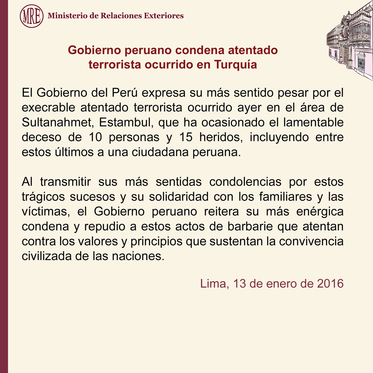 #InfoCancillería: Gobierno peruano condena atentado terrorista ocurrido en #Turquía http://bit.ly/1OrnwMV pic.twitter.com/zL6oZAyChw
