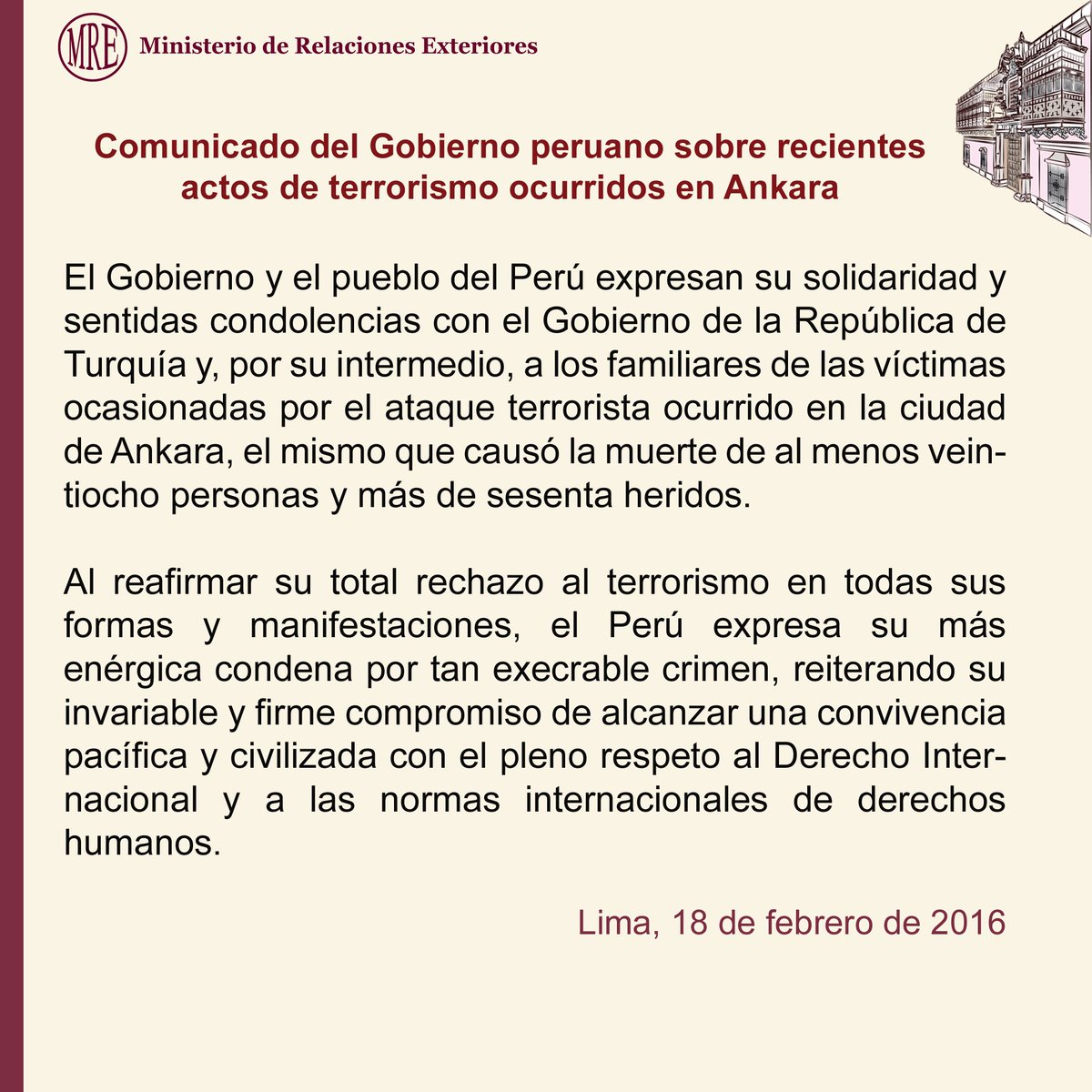 Peru expresses its strongest condemnation of #terrorist acts in Ankara, #Turkey http://bit.ly/20GjTZo pic.twitter.com/pU754k9OnR