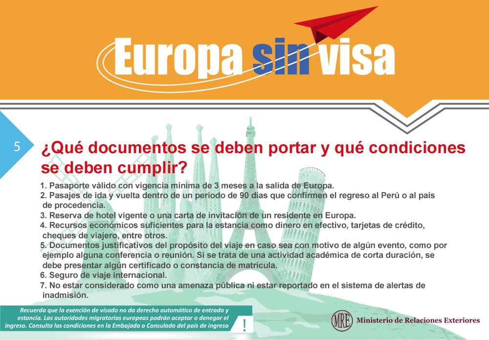 #EuropaSinVisa: ¿Qué documentos se deben portar y qué condiciones se deben cumplir? Ingresa: http://www.rree.gob.pe/europasinvisa pic.twitter.com/0h0N2Nmhx7
