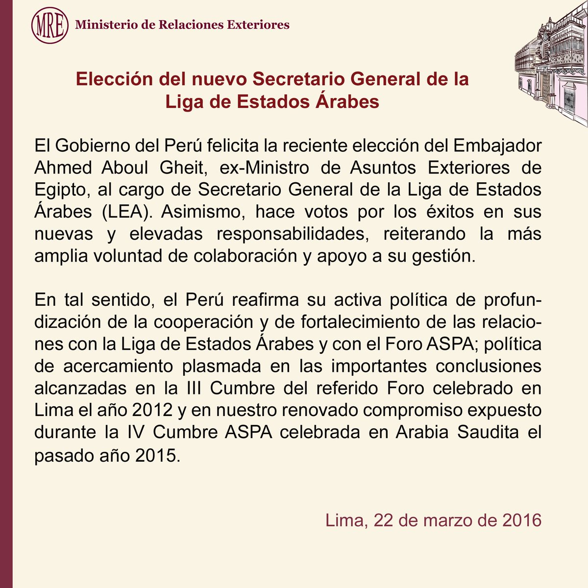 Gobierno del #Perú felicita elección del nuevo Secretario General de Liga de #EstadosÁrabes http://bit.ly/1LEjXaV pic.twitter.com/7qLAAInZ3U