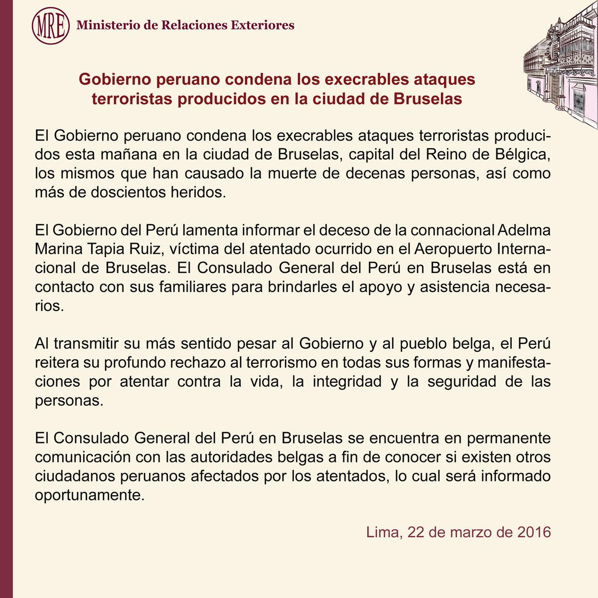#InfoCancillería: Gobierno del #Perú condena execrables ataques terroristas producidos esta mañana en #Bruselaspic.twitter.com/fmQX4B87Wh