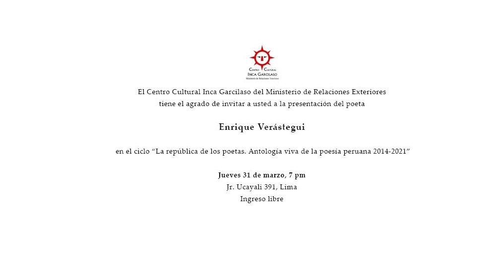 Hoy, 7pm en el @CCIncaGarcilaso: Presentación del #poeta Enrique Verástegui #IngresoLibrepic.twitter.com/Ialk0N8ZhZ