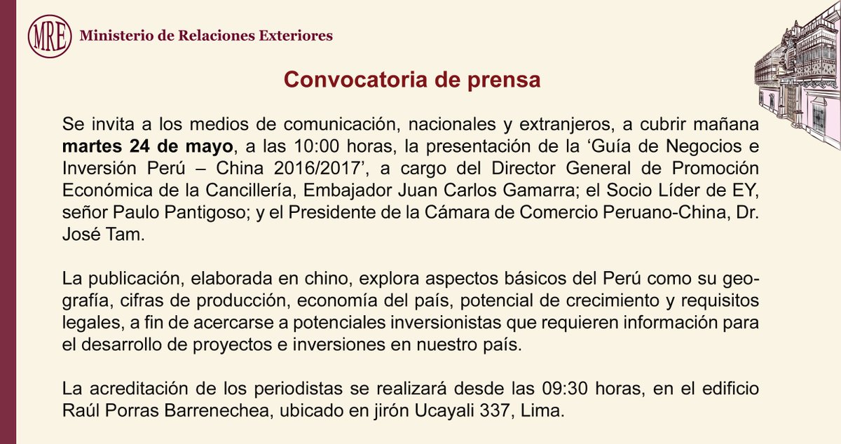 Atención #periodistas, convocatoria de prensa: Presentación de Guía de Negocios e #Inversión Perú - China 2016/2017pic.twitter.com/0uPDMm8Qos