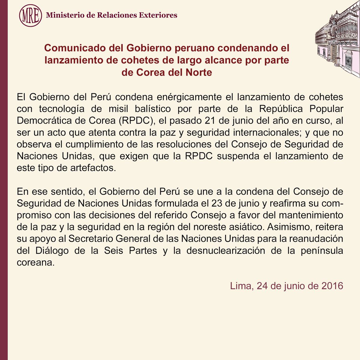 Gobierno del #Perú condenando lanzamiento de cohetes de largo alcance por parte de Corea del Nortepic.twitter.com/KNznIHliLg