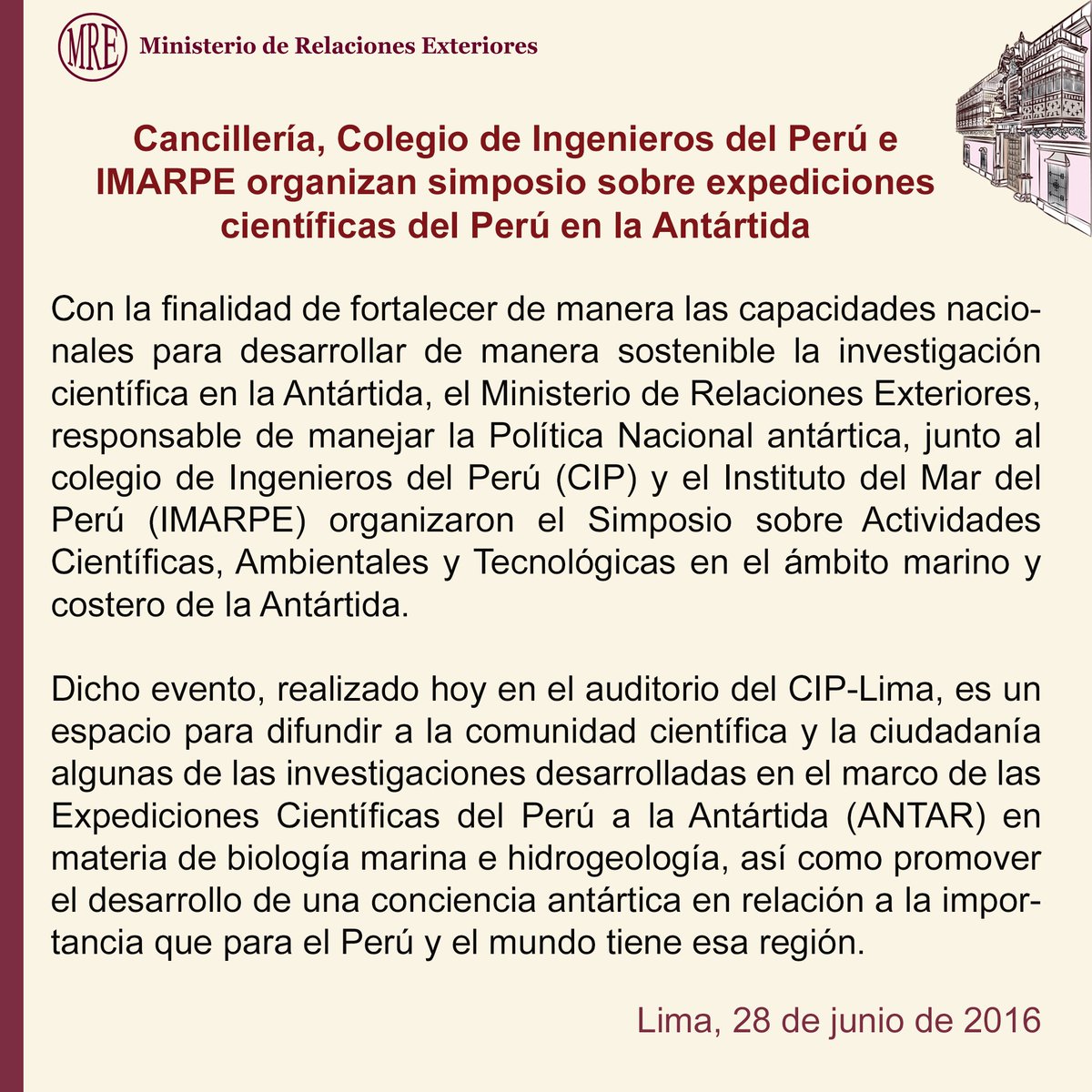 Cancillería, @CIP_CN e #IMARPE organizan simposio sobre expediciones científicas del #Perú en la #Antártidapic.twitter.com/gxJgtOOEZ0