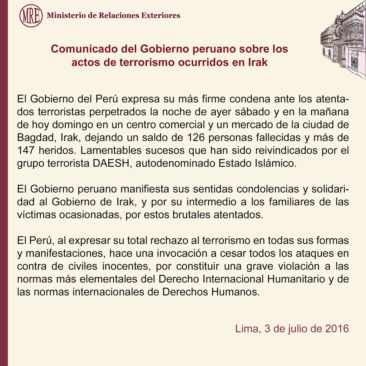 Gobierno peruano manifiesta sentidas condolencias y solidaridad al Gobierno de #Irak por atentados en #Bagdadpic.twitter.com/83HSOPppIS