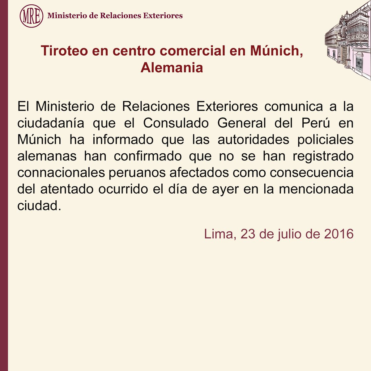 Autoridades policiales de #Alemania confirmaron que no se han registrado #peruanos afectados por tiroteo en #Múnichpic.twitter.com/92f4asZjdF