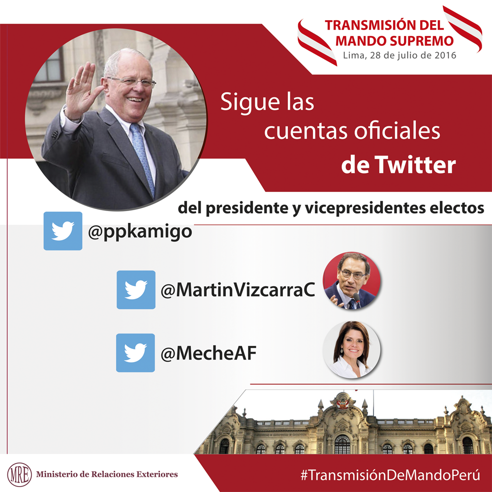 ¡Gobierno digital! Sigue las cuentas del pdte. y vicepresidentes electos @ppkamigo, @MartinVizcarraC y @MecheAFpic.twitter.com/s6pbbmfKxY