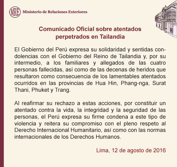 Gobierno de #Perú expresa solidaridad y condolencias con #Tailandia por cadena de atentados http://bit.ly/2aSBQ5S pic.twitter.com/BGXVgRuRzh